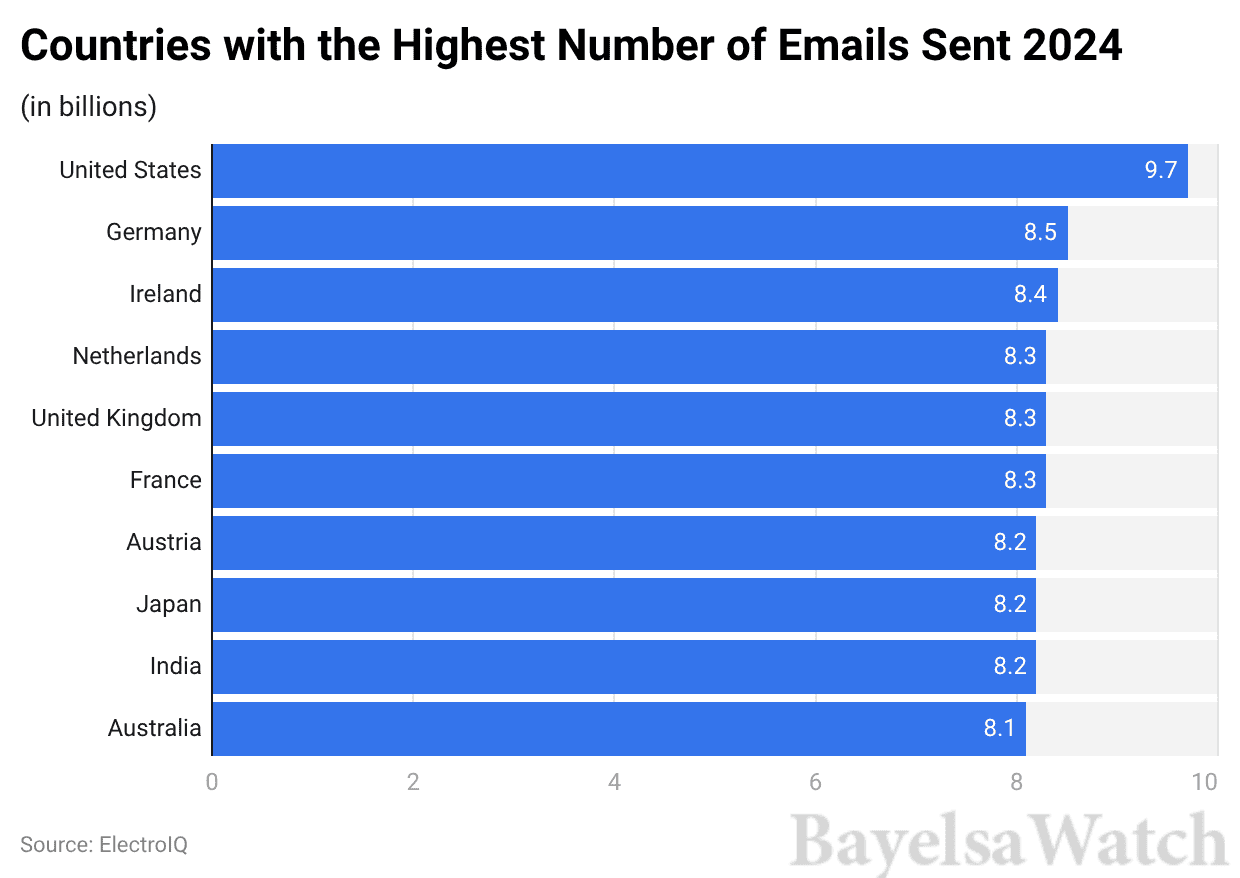 - In 2024, the United States sent 9.7 billion emails, followed by Germany (8.5 billion) and Ireland (8.4 billion).