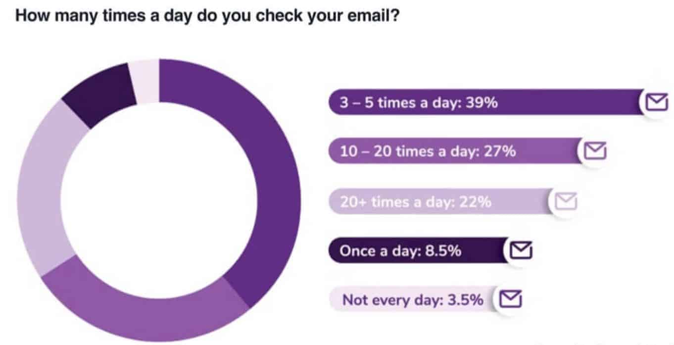 - Moreover, 27% check email 10-20 times a day, followed by 22% (more than 20 times), 8.5% (once daily), and 3.5% (don’t check every day).