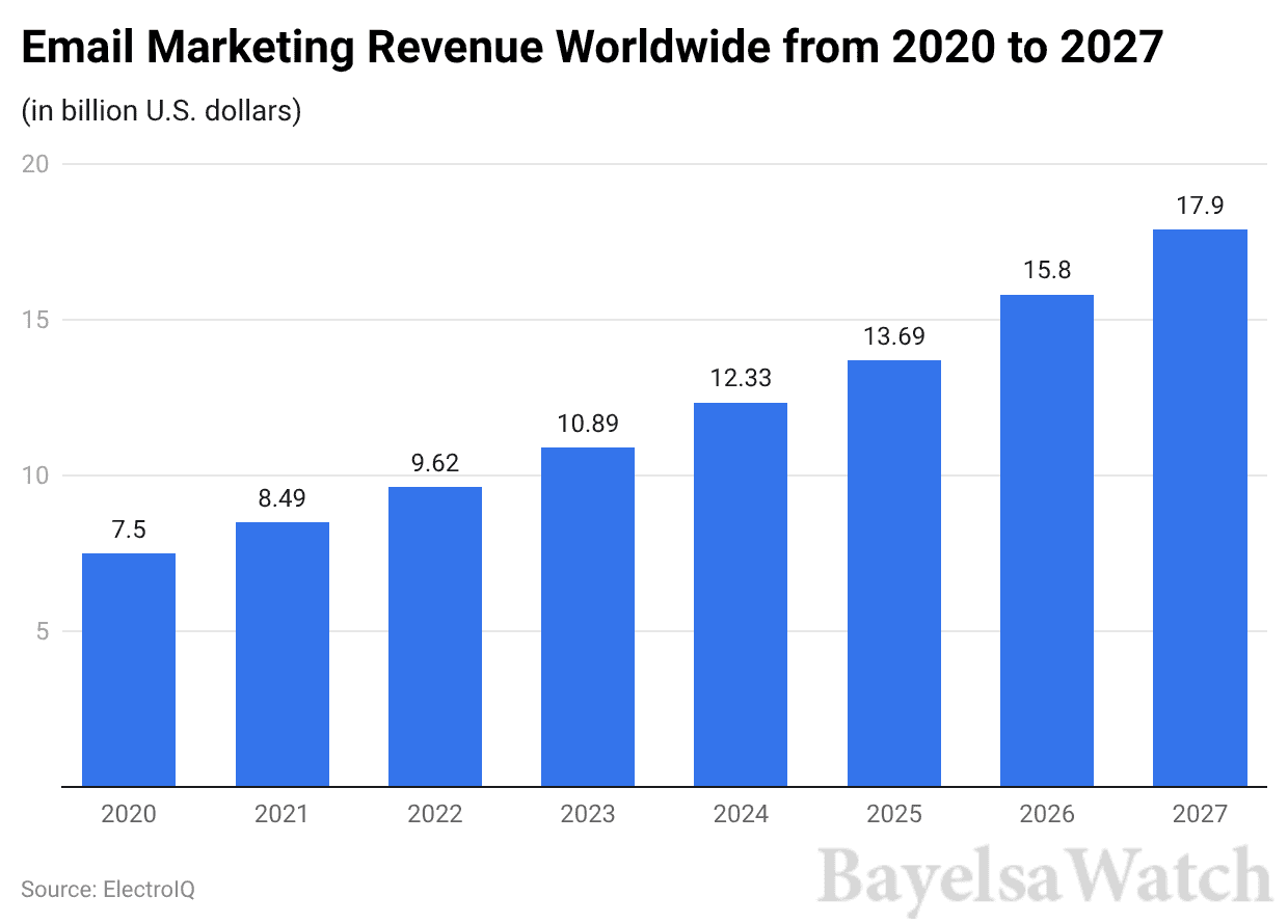 - By 2026, global email marketing revenue is estimated to reach approximately USD 15.81 billion, up from USD 13.69 billion in 2025.