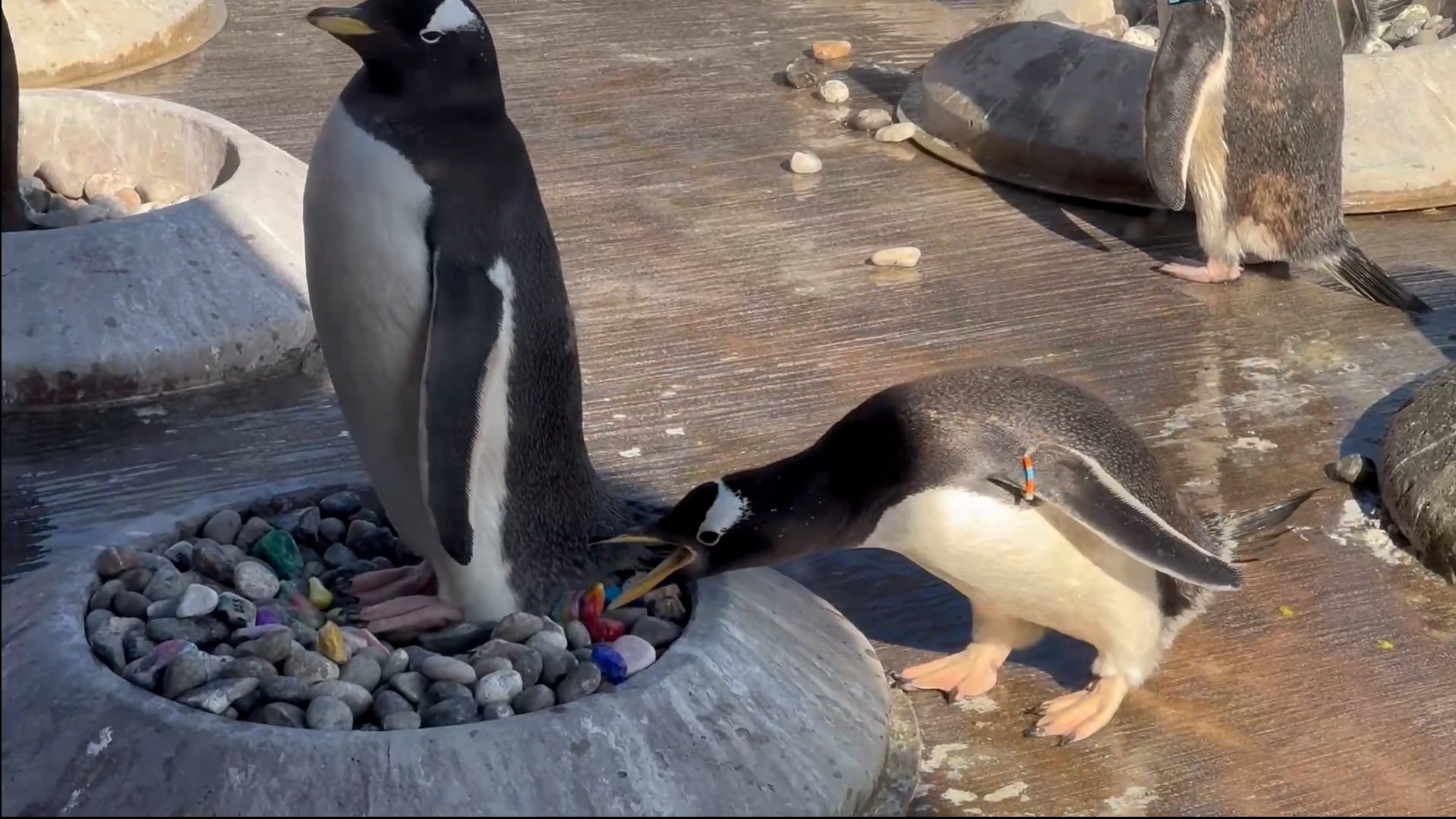 At the Edinburgh Zoo in Scotland, penguins were filmed sifting through a pile of colorful pebbles with their beaks and delivering them to their partners.