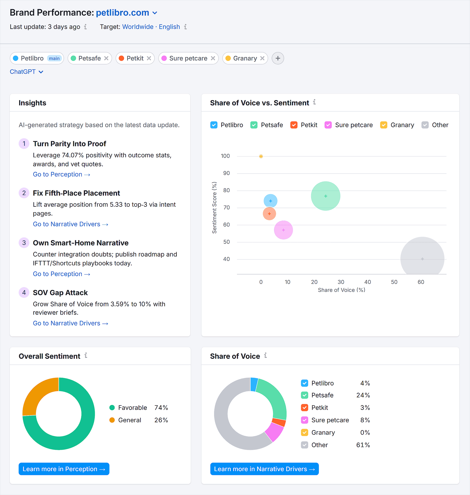 The most interesting thing I noticed right away is that Petlibro has relatively low Share of Voice (6%) in regular ChatGPT, without Search.