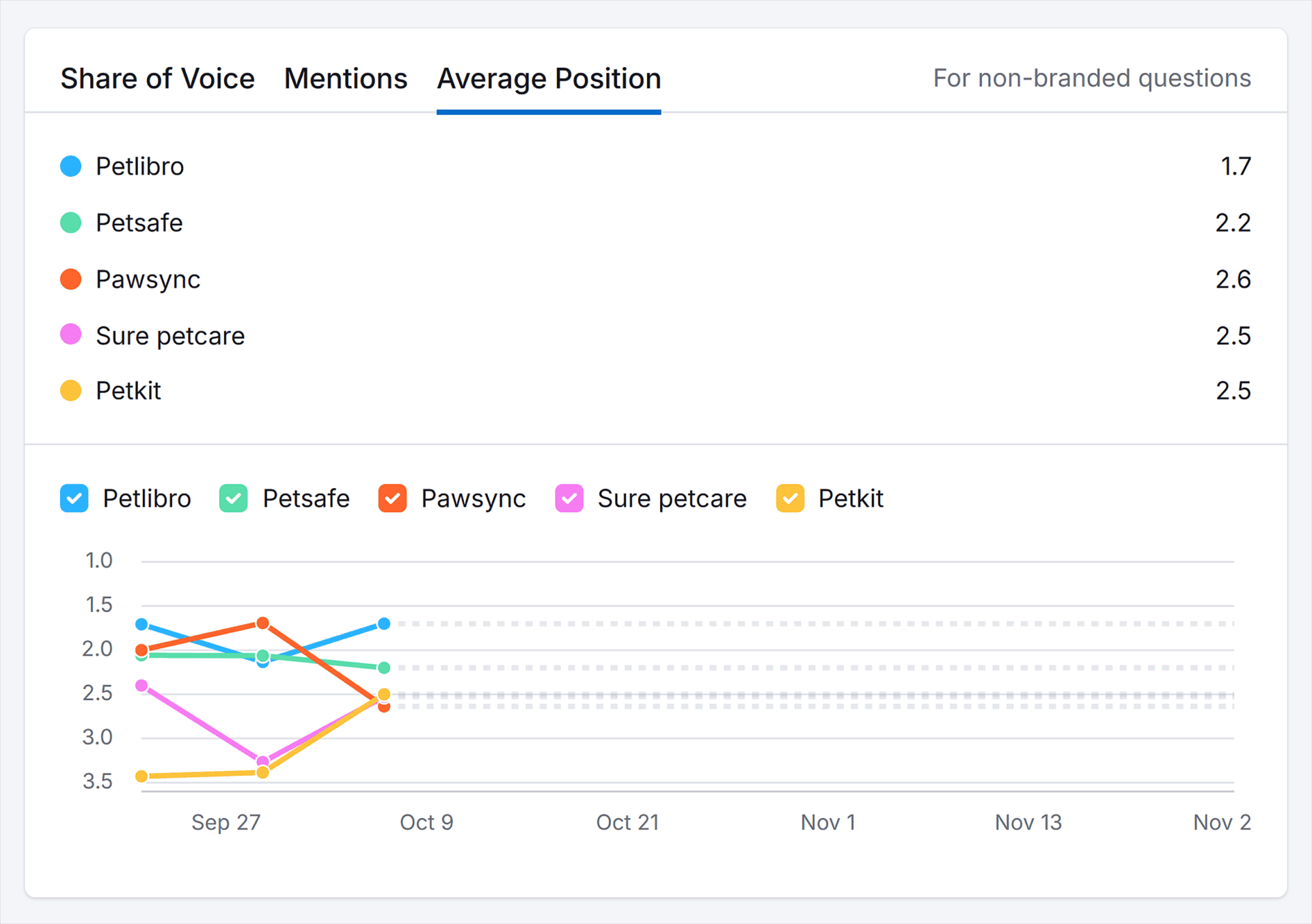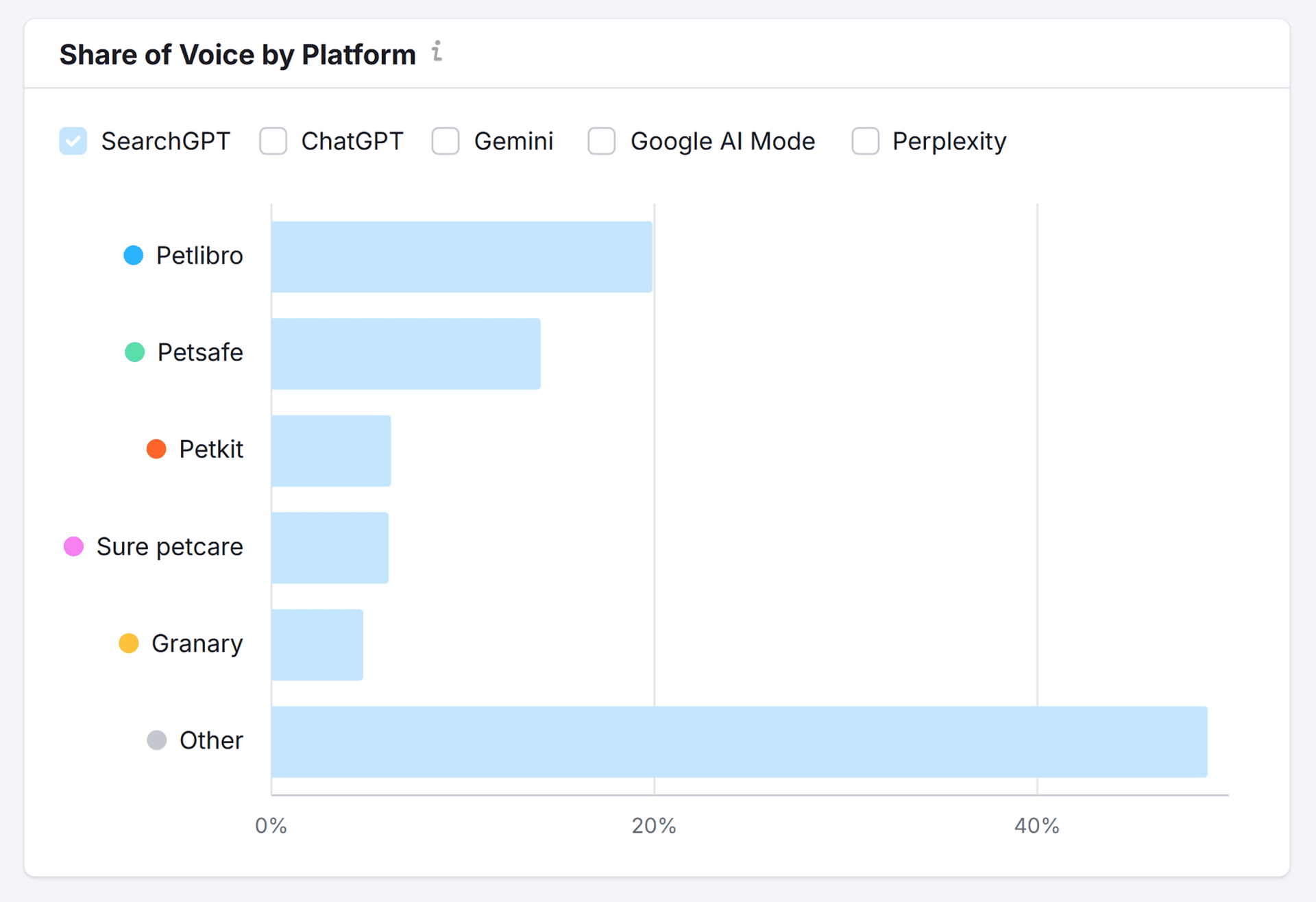 Fortunately, they’re performing much better in SearchGPT, Google AI Mode, and Perplexity. All three of which use live search to generate their answers. For example, Petlibro’s Share of Voice in Google AI Mode is 27.8%: