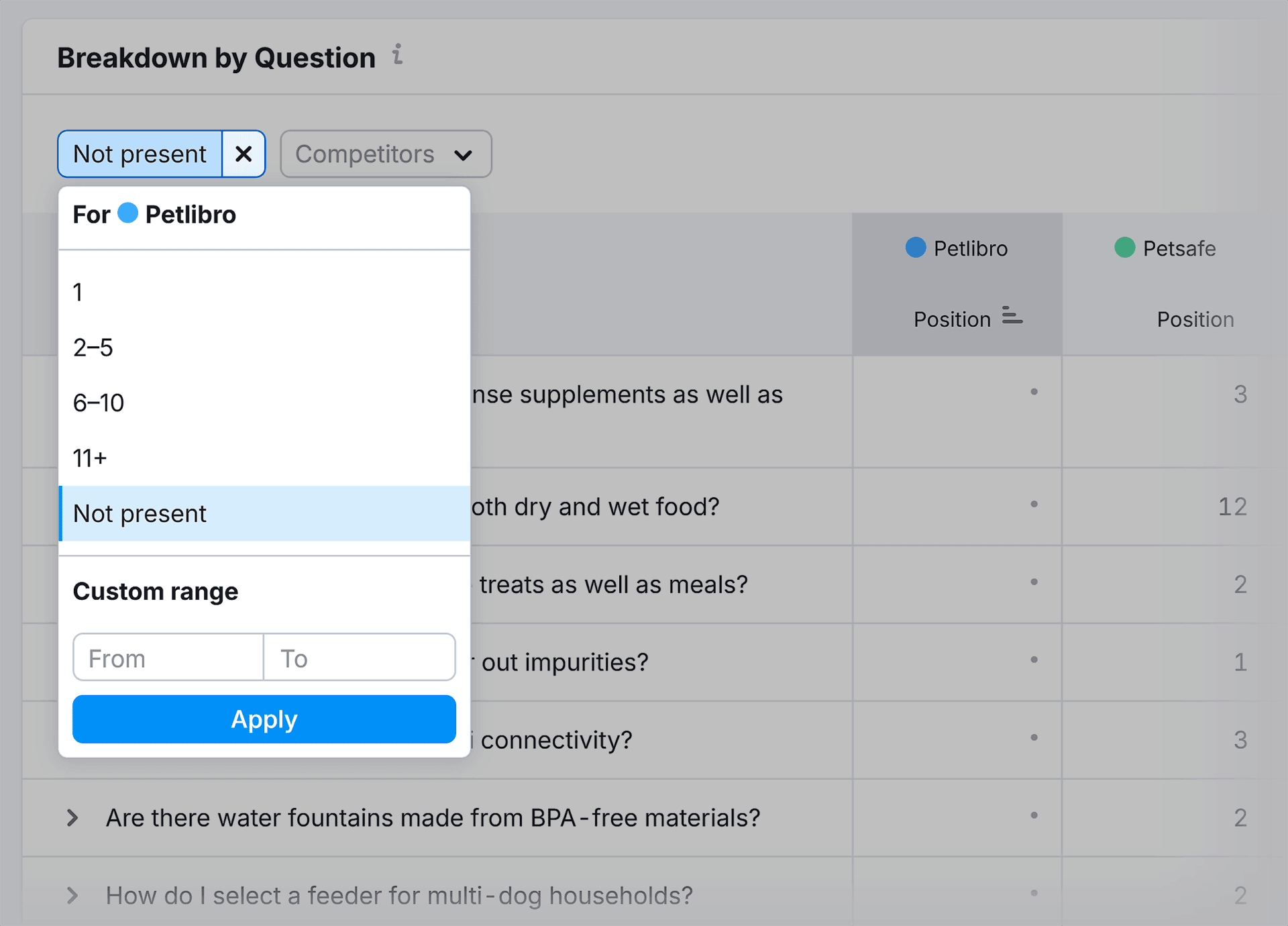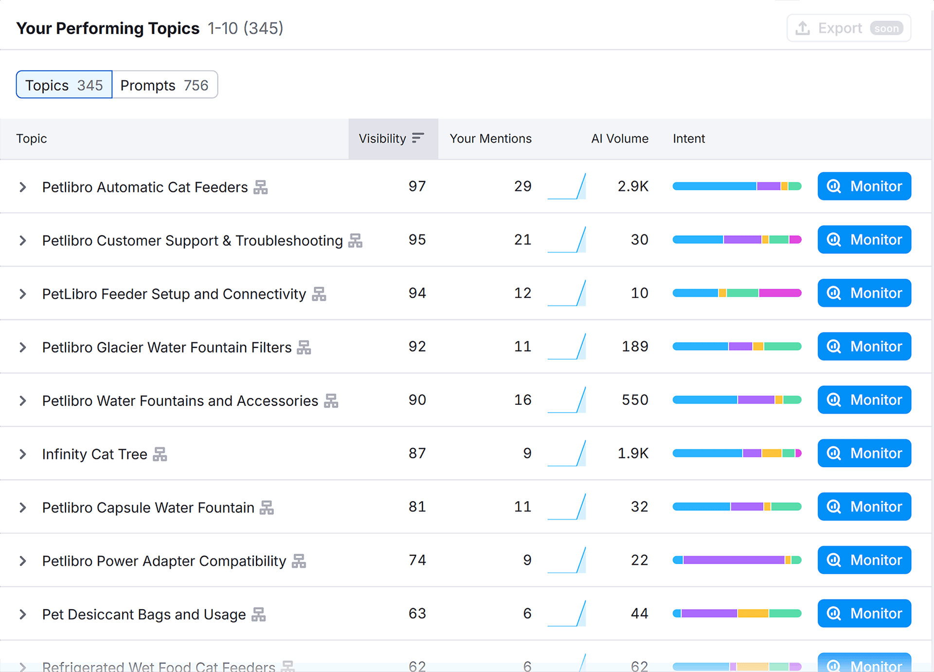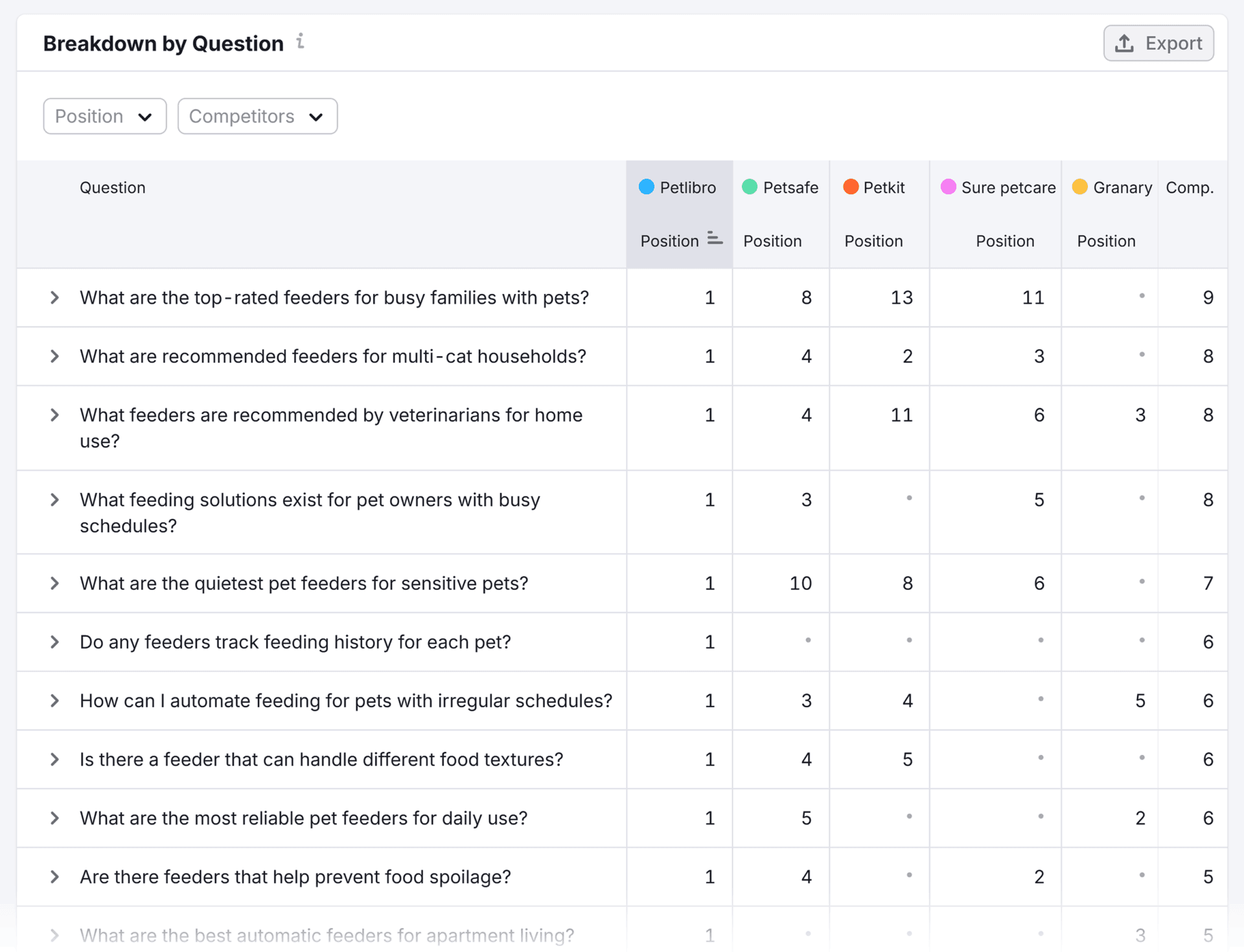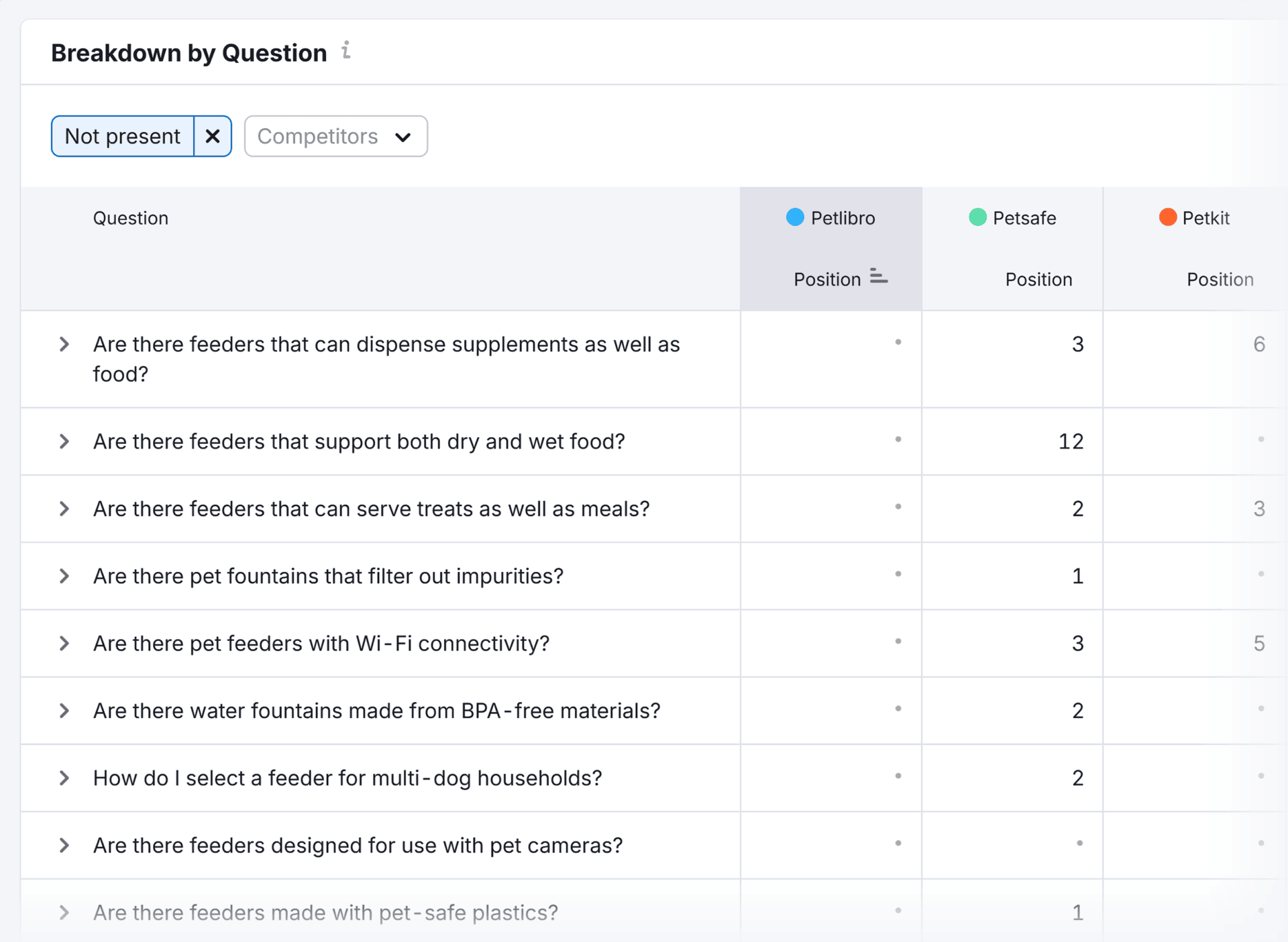 For example, Petlibro isn’t appearing for a few prompts that multiple competitors are mentioned in: