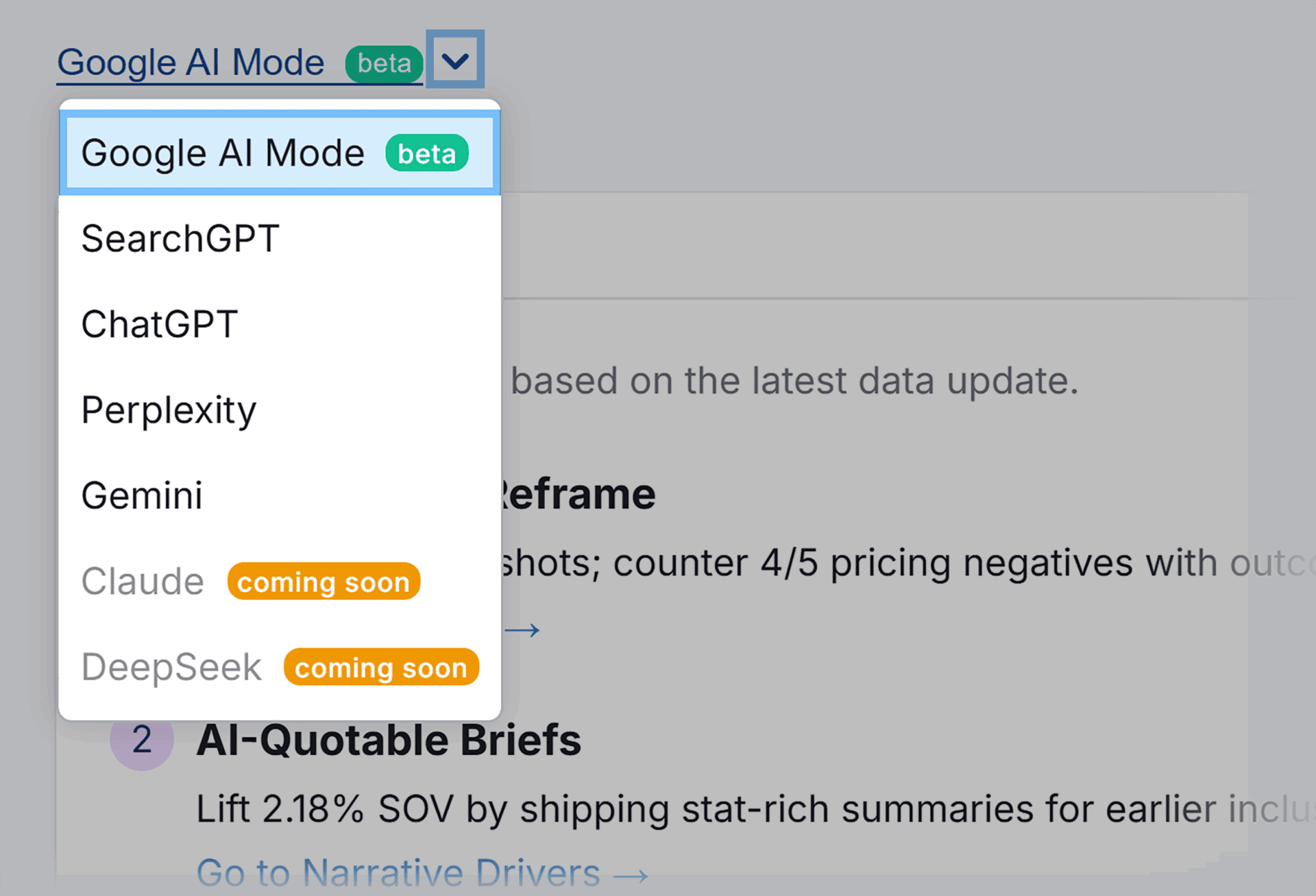 Identify the most relevant queries you want to start appearing for, and do this for each AI tool (using the toggle at the top left).