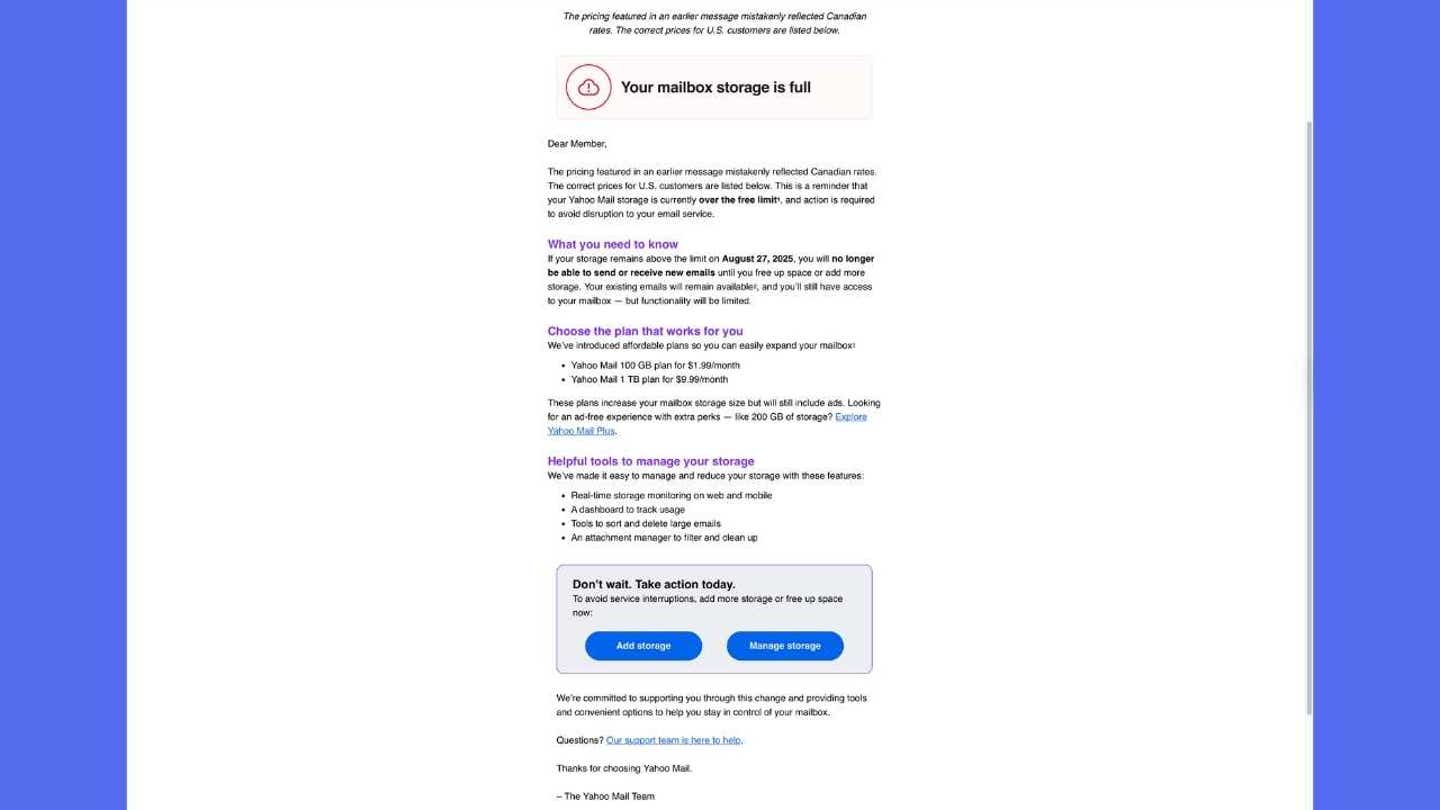 Recently, Stacy from Nashville, Tennessee, wrote in asking if a message from Yahoo about storage limits and pricing was real or just another scam. The email claimed she’d maxed out her free storage and risked losing email access unless she upgraded or cleared space. Sound familiar?